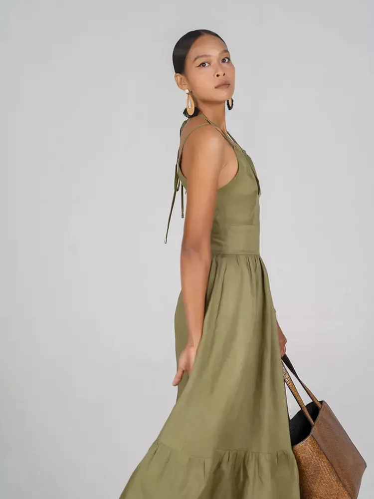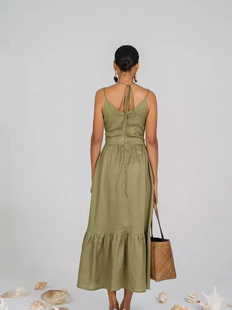 லேடி டீப் வி நெக் லாங் கேஷுவல் லினன் ஆடை விவரங்கள்